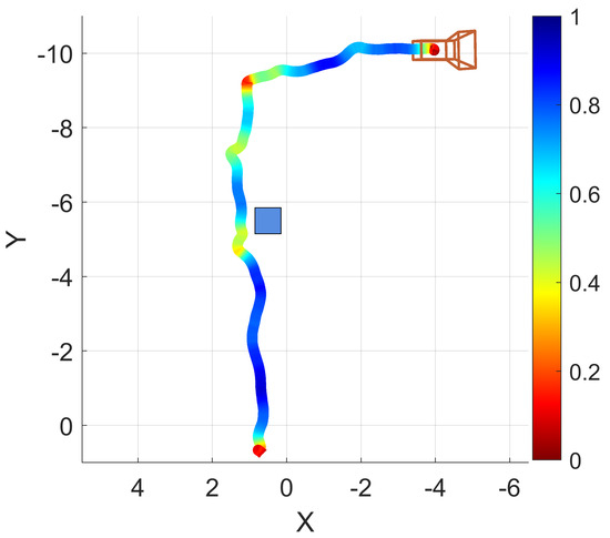 Another example navigation session was conducted in which the operator walked forward through a hallway, navigated around an obstacle, turned right, and moved down another hallway. A path trace visualization of this example is provided as Figure 9. The path trace is shown with a box plotted in the approximate real-world position of the obstacle (a recycling bin). Encoded in the trace color is the normalized traversal speed, red indicating slower traversal and blue indicating faster traversal.