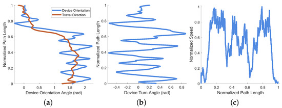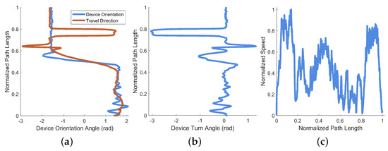 For this example data, recorded in a stairwell, the amount of “seeking” was calculated as 2.56 radians (). Visible in both Figure 14a,b at approximately 80% along the normalized path length is a large angular shift with a plateau followed by a shift back of equivalent magnitude. This shift-and-hold is caused by a reversal of movement direction by the recording device. This reversal is demonstrated by the computed device turn angle in Figure 14b, where the plateau is radians shifted from the previous orientation (equivalent to an “about face” as the user turns on the stairs).