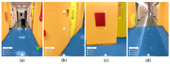 Once the design and implementation had undergone initial testing in purely virtual environments, the development was continued using a mobile device within real-world environments in preparation for the execution of the described study protocol. Figure 7 shows an example real-world use of EchoSee within a living room setting. An updated configuration of sources is shown, comprised of four sources, three across the center of the scene (one offset to each side and one in the middle) with the fourth at an angular offset down from the center. The color texturing that is visible in the scene shows the classification of the different surfaces produced by ARKit. The surface classification is also represented by the text labels on the audio sources (i.e., “floor” on the bottom source in blue, and “none”, “wall”, and “door” from left to right, respectively, in Figure 7b).
