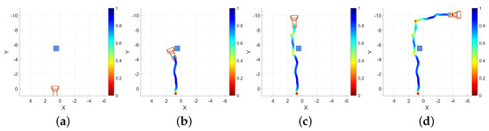 A screen capture was taken of the device while this example data was being collected. Four representative frames from that capture are presented as Figure 11. The first frame (Figure 11a) is taken from the beginning of the recording, the different classifications that are applied to the floor and walls are apparent by their blue and orange texturing, respectively. Two audio sources are visible, represented by raycast spheres, the offset sphere in the center of the image at a distance down the hallway and the down offset sphere visible at the bottom of the frame with a larger apparent size due to its proximity. The second frame (Figure 11b) is taken from approximately one third of the way through the recording, just as the operator navigates to the left around the obstacle. The yellow coloring to the right of center is a correctly classified door. Furthermore, visible in Figure 11b are three spheres at different positions relative to the capture device than those shown in Figure 11a. These differences are again due to the dynamically updated mesh environment, which causes the sources’ governing raycasts to update. The third frame (Figure 11c) is taken from approximately two thirds of the way through the recording, as the operator navigates to the end of the hallway and is about to turn right. The same three sources are visible in this frame as in the previous, but again, in slightly different positions, reflecting their response to the altered scene geometry and the user’s position within the scene. The final frame presented for this example (Figure 11d) is taken from the end of the recording, after the operator has turned to the right at the end of the first hallway and walked a short distance. Path trace visualizations were created for each of the frames presented in Figure 11; the position of the camera model correspond to the position of the capture device in each extracted frame. These path traces are shown in Figure 12 and labeled equivalently to the frame in Figure 11 that they represent.