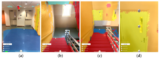 As with the hallway example, the recorded data from this example session included the internal data from EchoSeee and a screen capture. Again, four representative views are shown from that screen capture, the first from the beginning of the session, and the second two from approximately one third and two thirds of the way through the session, respectively, with the final frame being taken from the end of the session. These frames are presented as Figure 15. The first frame (Figure 15a) shows the approach to the doors at the top of the stairwell, beyond which is a small landing. The second frame (Figure 15b) is a view from the top of the first set of stairs, just through the doors. Note the correct classification of the stairs in this frame as “other”, rather than as “floor”, which is denoted by their red mesh. Furthermore, note the deviation of the offset sphere from the center of the frame as it moves in response to the changing geometry which is encountered by its controlling raycast. The third frame (Figure 15c) shows a view down the second set of stairs after making a turn to the right, around the landing visible at the center of Figure 15b. The fourth frame (Figure 15d) is a view of the doorway out of the stairwell and onto the lower floor. Note the correct classification of the door in yellow and the three spheres down the middle of the frame showing the positions of the upper, central, and lower audio sources, respectively. While there are six spheres emitting sound, three of them are not visible due to the limited field of view of the device, namely, the left and right offset spheres and the downward offset sphere.