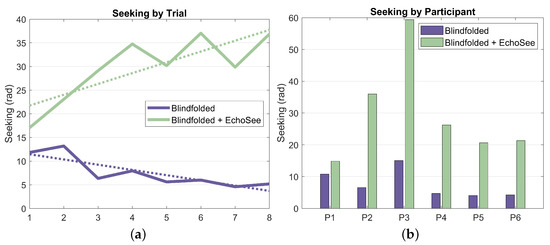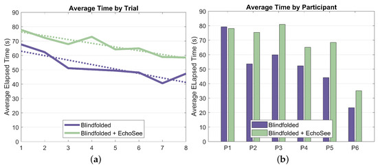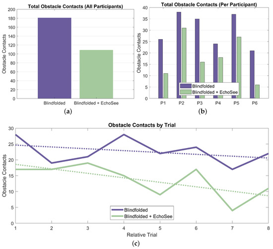 The number of collisions was collated over the 16 Treatment Phase 1 and 2 trials for the six participants. For Condition B (blindfolded unassisted), there were 181 total contacts and under Condition C (blindfolded with assistance), there were 109 total contacts as presented in Figure 16. These results show a substantial reduction in the number of contacts recorded with the assistance of EchoSee compared to without it. This advantage holds both in aggregate, and on a per-participant basis as shown in Figure 16a,b. There is also evidence of learning effects, demonstrating that the participants were improving their performance over time. These effects are present for both the unassisted and assisted trial conditions, however the rate of improvement (the slope of the trendline) is steeper for the assisted case (−1.42 collisions per trial) as compared to the unassisted case (only −0.58 collisions per trial).