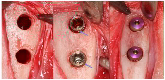 - Kanayama, M.; Ferri, M.; Guzon, F.M.M.; Asano, A.; Alccayhuaman, K.A.A.; Rossi, E.F.; Botticelli, D. Influence on marginal bone levels at implants equipped with blades aiming to control the lateral pressure on the cortical bone. An experimental study in dogs. Oral Maxillofac. Surg. 2024. Epub ahead of print. [Google Scholar] [CrossRef] [PubMed]