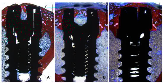 - Soto-Peñaloza, D.; Caneva, M.; Viña-Almunia, J.; Martin-de-Llano, J.J.; García-Mira, B.; Peñarrocha-Oltra, D.; Botticelli, D.; Peñarrocha-Diago, M. Effect on osseointegration of two implant macro-designs: A histomorphometric analysis of bicortically installed implants in different topographic sites of rabbit’s tibiae. Med. Oral Patol. Oral Cir. Bucal 2019, 24, e502–e510. [Google Scholar] [CrossRef] [PubMed] [PubMed Central]