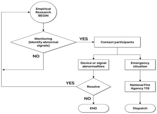 Wonju Severance Christian Hospital operates an IoMT monitoring center for digital health research, including remote monitoring and non-face-to-face collaboration. At the IoMT monitoring center, a physician, who was an emergency medicine specialist, collected health status information such as basic information, vital signs (blood pressure and body temperature), medical history, and medications surveyed by participants at the empirical research site. After that, he monitored the hikers’ biosignals transmitted in real time to check whether an abnormal ECG was observed. If an abnormal signal was detected during ECG biosignal monitoring and disease was suspected, the physician notified the clinical research coordinators (CRCs) at the empirical research site, and then the CRCs advised the participant to visit a hospital. Also, if problems such as noise in the device or disconnection due to poor attachment occurred, the problem was resolved through on-site response. In the event of an emergency, the condition of the participant was checked according to the emergency response protocol, and the patient’s condition and location information was delivered to the National Fire Agency 119 to prepare for rapid emergency treatment through emergency dispatch (Figure 1).