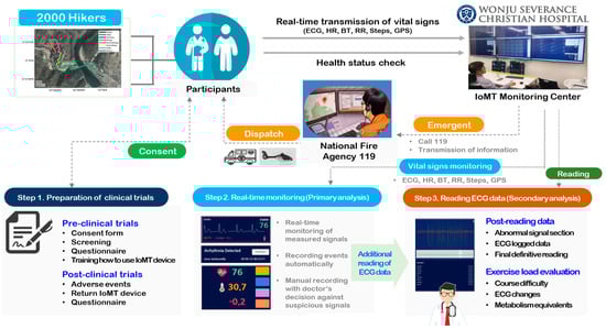 In this study, a clinical trial was conducted to verify the effectiveness of remote monitoring diagnosis technology using an IoMT device. The clinical trial was conducted a total of 30 times in about 8 months and a total of 2000 hikers participated. The inclusion criteria were adults aged 19 years or older, who gave written consent to participate in the empirical research, and who could understand and follow the on-site training and instructions. Also, the exclusion criteria encompassed those who could not attach the patch-type IoMT device due to skin disease, those who were pregnant, those who were participating in another clinical trial at the same time, or those who had recently completed participation in a previous clinical trial. Each hiker filled out a survey about the clinical trial consent and existing health information in advance, then attached a wearable ECG monitoring patch to their chest and climbed a mountain. This study was carried out with approval from the Research Ethics Committee of Yonsei University Wonju Severance Christian Hospital (IRB approval number: CR319186) and registered with the Clinical Research Information Service (CRIS) operated by the Korea Disease Control and Prevention Agency (CRIS trial registration number: KCT0005795).