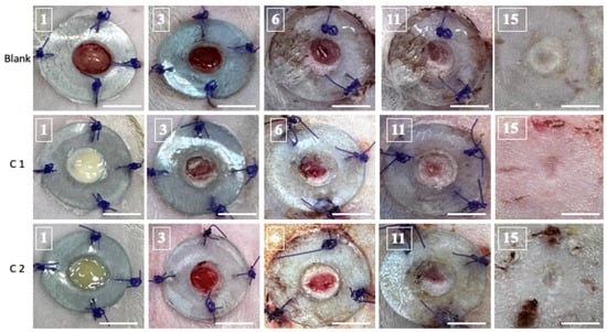 When the epidermal barrier is breached, the cellular and chemical responses inside the skin layers will synchronize to begin the recovery process. Access to the skin creates ideal circumstances for germs to colonize and reproduce uncontrollably. Skin healing was assessed through macroscopic screening. Optical pictures of the wound were captured from the first day to the fifteenth day (Figure 2). Subtle compositional variations between the C1 and C2 groups are also evident in regards to the coloration of the resulting bioproducts.