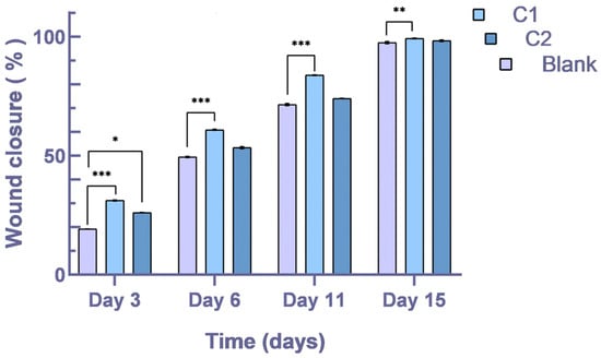Percentage of wound closure of the defect treated with C1 and C2 composite cements. Statistical evaluations performed using one- and two-way ANOVA; * p < 0.05; ** p < 0.01; *** p < 0.001.
