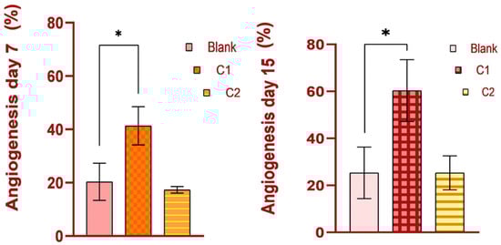 Angiogenesis (%) on day 7 versus day 15.; pronounced vascularization in C1 groups; * p < 0.05.