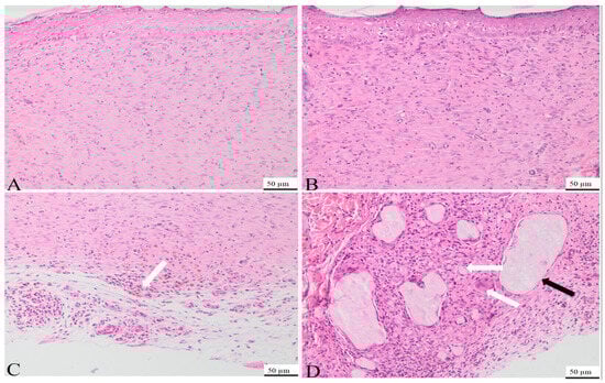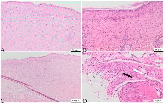 Photomicrographs of skin and subcutis obtained on day 15 from the control group (A,C) and from rats treated with the C1 biomaterial (B,D). In the control group, the defect is filled with fibrous tissue composed of fibroblasts oriented parallel to the epidermis, collagen fibers, and blood vessels, and covered by a completely regenerated epidermis (A), H&E, 50 µm; multifocally, predominantly in the deep dermis, scattered lymphocytes and plasma cells are present within the scar tissue (C), H&E, 100 µm; (B): the defect is replaced by fibrous tissue composed of fibroblasts oriented parallel to the epidermis, mature collagen fibers, scattered inflammatory cells, mainly lymphocytes and plasma cells, and regenerated sebaceous units covered by a completely regenerated epidermis (B), H&E, 50 µm; (D): fragmented biomaterial present within the cytoplasm of the macrophages (black arrow) and rare multinucleated macrophages (white arrow) within the deep dermis, (D): H&E, 50 µm.