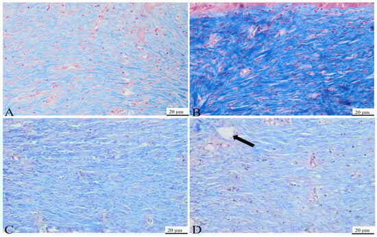 On day 15, the tissue sections from the rats treated with C1 material showed complete defect healing. The dermis was replaced by fibrous tissue (Figure 8), composed of fibroblasts aligned parallel to the epidermis, vascular channels with erythrocytes present in the lumen (Figure 6B), and a scattered inflammatory infiltrate primarily composed of lymphocytes and plasma cells, features confirmed by MT staining (Figure 7B). Additionally, partial restoration of sebaceous units was identified at the defect site. Focally, in the deep dermis, within the cytoplasm of some macrophages, fragmented biomaterial was observed, without any biomaterial in the extracellular space, proving its complete resorption. Rare multinucleated macrophages were noted at this level (Figure 6D).