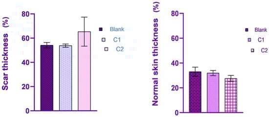 The percentage of wound closure was determined and applied to compare the outcomes between the Blank, C1, and C2 groups. In comparison to those treated with C2, the content regenerates more quickly in the first week of therapy for those treated with C1 (Figure 4). This suggests that the C1’s mineral filler content impacts the rate at which the healing process develops. Therefore, future research featuring immunocompromised subjects who could benefit from this prospective usage should be conducted.