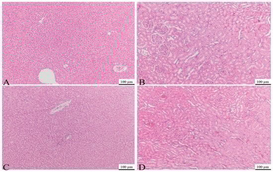 Photomicrographs of the kidney and liver obtained on day 15 from the C1 group (A,B) and C2 group (C,D), with no significant findings noted; H&E, 100 µm.