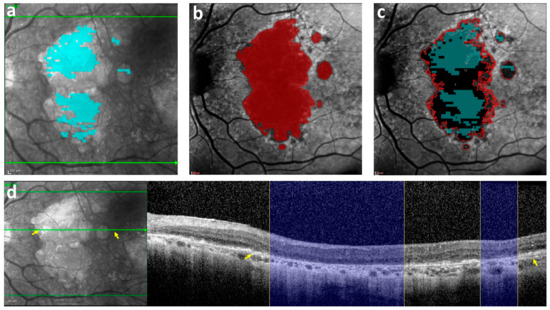 In the past decade, automatic algorithms for GA annotation using OCT showed good correlations with human expert manual annotations [11,12,13,14,15]. Likewise, the automatic annotation of GA using FAF is also in use, e.g., the Region Finder software (Ver. 2.6.6.0, Heidelberg Engineering Inc., Heidelberg, Germany) [16].
