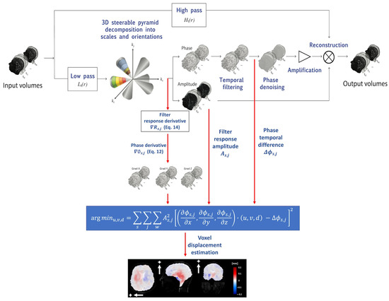 The bandpass phases proceed through two distinct processing pathways: (a) the original 3D aMRI algorithm [36], which includes phase denoising using an amplitude-weighted Gaussian smoothing filter, multiplication by the amplification factor , and reconstruction that results in motion magnification, and (b) the new voxel displacement quantification algorithm. The quantification algorithm is based on solving the optical flow equation, which assumes the brightness constancy constraint (that the brightness of a moving point in an image remains constant over time). However, there is a subtle distinction from the standard optical flow approach that we use here. The equation is instead solved over the filtered phases of the coefficients of the 3D complex-valued steerable pyramid decomposition. Here, we are guided by the work from Fleet and Jepson [38], who showed the general case whereby the temporal evolution of (spatial) contours with constant phase in the image subbands (such as used in a complex wavelet decomposition) correspond to the motion field. Mathematically, this can be written as follows: