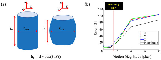 The following were evaluated: (1) the algorithm’s accuracy as a function of the magnitude of the true motion (Figure 2b); (2) the algorithm’s robustness to various Gaussian noise levels (Table 2); and (3) the effects of the algorithm’s hyperparameters (number of pyramid levels in the least squares, temporal filtering, and Gaussian window parameter) and various temporal frequency motions on the estimated motion field (Supplemental Figures S1–S4).