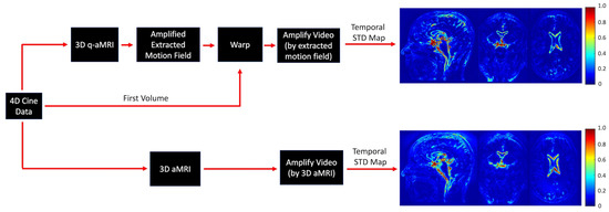 To validate the ability of 3D q-aMRI to accurately quantify the observed motion in 3D aMRI, we followed three steps. First, 3D aMRI was used to amplify the signal in the 4D in vivo data. Then, the voxel displacement field was calculated using 3D q-aMRI, and a second amplified video was created by warping the first volume in the data according to an amplified version of the estimated motion field. Next, normalized temporal standard deviation maps were calculated for both amplified videos (Figure 3), and these were compared qualitatively.