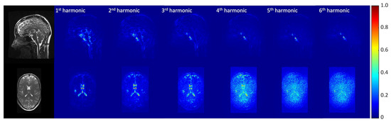 Figure 5 shows the normalized temporal standard deviation maps of the amplified (3D aMRI) videos (Supplemental Video S4) for different temporal frequency bands, demonstrating that motion information exists within the one to four heart rate harmonics band.