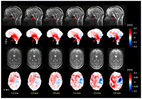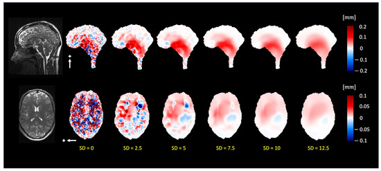 Previous research has illustrated the intricate nature of the brain’s biomechanics, showing the interplay between the CSF and the pulsatile brain motion. The general characteristics of pulsatile brain motion and the estimated voxel displacement field extracted by 3D q-aMRI resemble the displacement field extracted by PC-MRI and other studies [5,6]. The predominant displacement of tissue and fluid occurs in the cranial–caudal direction in the sagittal and coronal planes. Additionally, the axial plane shows expansion/contraction motion, and the most significant tissue displacement is concentrated around the midbrain, brainstem, cerebellar tonsil, and hypothalamus regions. Due to the reduced perfusion of brain tissue toward the cranium boundary, minimal displacement is observed in the frontal lobe, parietal lobe, occipital lobe, temporal lobe, and posterior cerebellum.