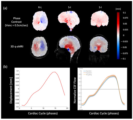 (a) Comparison between PC-MRI (top) and 3D q-aMRI (bottom) for sagittal (S/I direction), coronal (S/I direction), and axial (L/R direction) planes. The estimated field captures the relative brain tissue deformation over time and the physical change in shape of the ventricles by the relative movement of the surrounding tissues. (b) The extracted flow/motion profile through the cerebral aqueduct as extracted by 3D q-aMRI (left), which is comparable to that reported by [46] as shown in the inset (right). Note that [46] the graph seen here is normalized, but the actual CSF flow values reported were an order of magnitude higher than the 3D q-aMRI flow profile.
