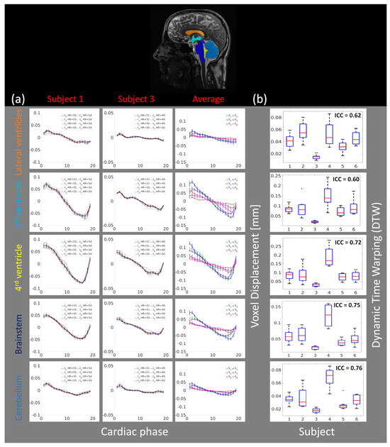 (a) The average (over different brain regions) voxel displacement profile for two subjects ( and ) in the S/I direction for eight scans ( to ). Top—the brain regions (lateral ventricles, 3rd ventricle, 4th ventricle, brainstem, and cerebellum) where the average voxel displacement was estimated. Bottom—the first two columns depict the voxel displacement profile for all scans, for each of the two subjects. The black line represents the average motion over all scans, together with an error bar (95% confidence interval). The last column depicts the average motion for all six subjects, along with error bars representing the 95% confidence interval. The results indicate high repeatability across the time points within each subject, with similar motion patterns but different magnitudes across all subjects. (b) The boxplots for each brain region and the Intraclass Correlation Coefficient (ICC) of the dynamic time warping (DTW) distance. The plus sign denotes an outlier.