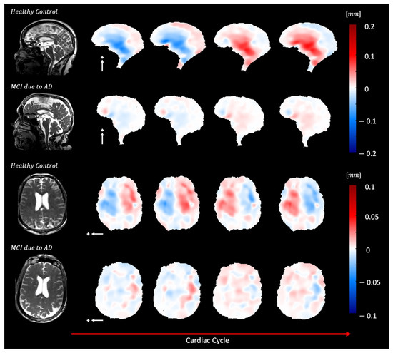 Figure 10 and Supplemental Video S10 show brain motion in a healthy control and a subject with mild cognitive impairment (MCI) due to Alzheimer’s disease (AD). In the AD participant, a diffuse reduction in brain bulk displacement is observed in both the sagittal and axial planes. Additionally, the displacement maps show a loss of symmetry and irregular motion of the lateral ventricles.
