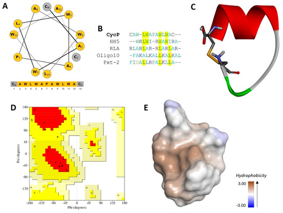 The solid-phase synthesis of a novel cyclic peptide, CycP, is carried out in the present study. We designed the peptide sequence with all-hydrophobic core amino acids with a polar cysteine residue at both the N and C terminus of the peptide (Figure 1A). The final output of peptide synthesis is a 13-amino-acid-long peptide that is cyclized by a disulfide bond. The synthesized peptide is further purified and characterized using RP-HPLC to determine the molecular weight and confirmation of the disulfide bond (Figures S1 and S2). A single peak collected from HPLC fractions showed a molecular mass of 1574.10 (M-H), which is 2Da less than the calculated molecular weight (1576.90 Da) of the peptide sequence using the Expasy ProtParam tool (https://web.expasy.org/protparam) (accessed on 6 February 2024) (Figure S2). We performed a sequence similarity search using the APD3 database to check the novelty of the newly synthesized peptide (Figure 1B). The sequence alignment revealed only 40% similarity to the HH5 synthetic peptide (APD ID: AP03954), which confirms the novelty of CycP. To have a look into the secondary structure of CycP, we made a helical wheel using the amino acid sequence that confirmed the presence of a helix in the peptide structure. Further, to obtain more details about the CycP 3D structure, we predicted the de novo 3D structure of the peptide employing the PEP-FOLD 2.0 server (Figure 1C). A Ramachandran plot analysis of the predicted structure revealed 80.0% residues in the most favored regions and 20.0% residues in additional allowed regions (Figure 1D). The results showed a high-quality cyclic helical structure for the CycP with an all-hydrophobic surface (Figure 1C,E).