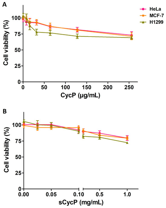 CycP and sCycP vesicles are non-cytotoxic. (A) MTT assay for CycP (A), and (B) sCycP vesicles against HeLa, MCF-7, and H1299 cell lines. PBS and 1% Triton X-100 were used as negative and positive controls, respectively. Error bars show the standard deviation (SD), while the statistical significance is considered at the level of p < 0.05. The experiment was performed three times independently in triplicate.