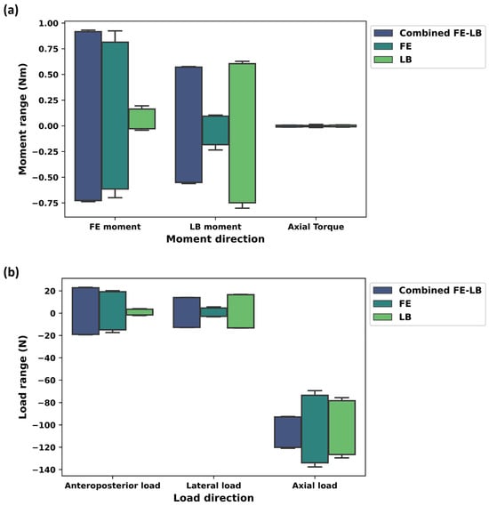 - Quantifying the forces and moments generated during the multiplanar motion (combined FE-LB). In this case, three component forces (i.e., Fx, Fy, and Fz) and three component moments (i.e., Tx, Ty, and Tz) were calculated, and the resultant values for forces and moments were then compared between the unidirectional motion test and the multiplanar motion test.