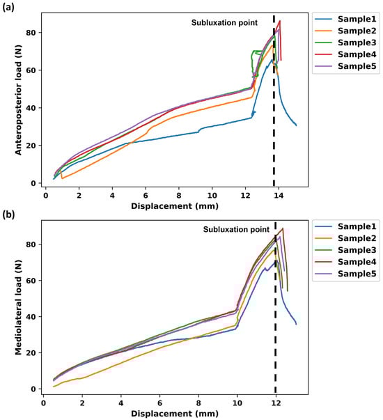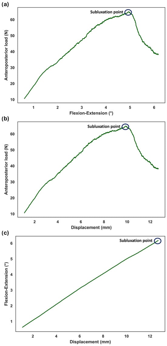 - Determining the conditions under which subluxation or dislocation occurs during combined rotational–translational movements. In this case, the lateral force, the degree of the rotation, and the translation were measured until the samples reached the subluxation point.