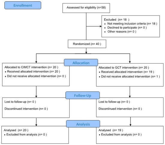 Ultimately, 20 participants in the CIMCT group and 19 in the GCT group took the same post-test as the pre-test and statistical analyses were performed on those who took the post-test without excluding anyone. Figure 1 presents the study process.
