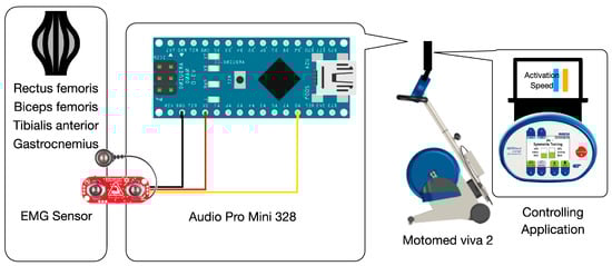 The sEMG-triggered CIMCT device used in this study represents a novel integration of bioengineering principles into rehabilitation. The device, comprising a myoelectric sensing unit, stationary bicycle, and control unit, uses four-channel sEMG sensors to capture muscle activity signals. The signals were processed into packets using an Arduino Pro Mini 328 (Arduino Pro Mini 328, SparkFun Electronics, Niwot, CO, USA), and then transmitted to the control unit via Bluetooth (Figure 2). These signals are transmitted via Bluetooth to a control unit that visualizes the data, providing patients with real-time feedback and enabling precise adjustments to therapy based on muscle activation. To minimize interference during the sEMG-triggered CIMCT study, we conducted the data collection in a space free from other electronic equipment. Additionally, to reduce interference caused by the sEMG cables touching each other, mesh coverings were applied to the cables.