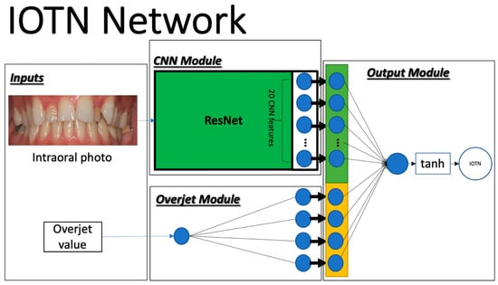 We developed a deep neural network, called the IOTN network, which takes two inputs and has three modules. The inputs are a 2D frontal intraoral image and an overjet numeric value, which was the median value of the overjet range at central incisors. The modules consist of a convolutional neural network (CNN) module, an overjet module, and an output module, corresponding to the two inputs (Figure 1).