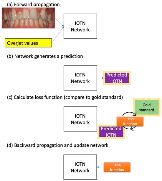 Schematic of a training process. (a) Forward propagation: The model receives the first two inputs, namely the intraoral image and the overjet value. (b) Network generates a prediction: The network generates a prediction based on these inputs, aiming to learn the output of the IOTN. (c) Calculate loss function: The predicted IOTN value is compared to the gold standard (third input) to calculate the discrepancy. (d) Backward propagation and update network: The discrepancy is back propagated through each layer of the network to update their parameters.