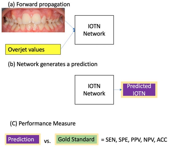 Schematic of a test process. (a) Forward propagation: The model takes the two inputs, namely the intraoral image and the overjet value. (b) Network generates a prediction: The network predicts an IOTN-AC grade based on these inputs. (c) Performance Measurement: Performance is assessed by comparing the predicted value to the gold standard using diagnostic metrics, including SEN (sensitivity), SPE (specificity), PPV (positive predictive value), NPV (negative predictive value), and ACC (accuracy).