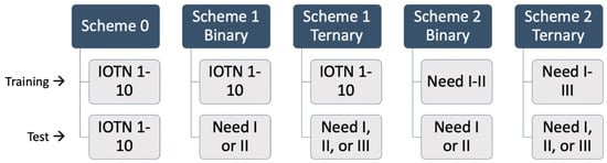 Summary of Scheme 0, Scheme 1, and Scheme 2: training and test. Need I or II is binary (IOTN 1–5 and 6–10). Need I, II, or III is ternary (IOTN 1–4, 5–7, and 8–10).