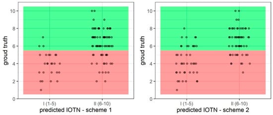 Scatter plots depicting binary prediction results for Scheme 1 (left) and Scheme 2 (right). In these plots, red region denotes IOTN-AC grades 1–5, while green region denotes IOTN-AC grades 6–10, as per the calibration clinician. Correct classifications are represented in the lower left and upper right quadrants of the plots.