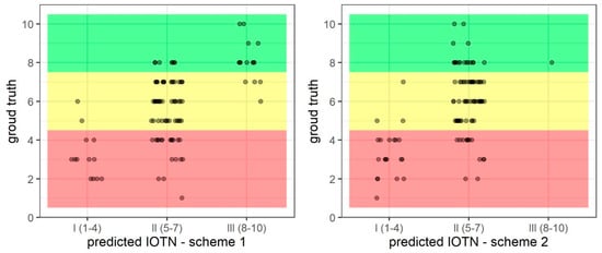 Scatter plots for ternary prediction results of Scheme 1 (left) and Scheme 2 (right). In these plots, red region denotes IOTN-AC grades 1–4, yellow region denotes IOTN-AC grades 5–7, and green region denotes IOTN-AC grades 8–10, as per the calibration clinician. Outcomes in the lower left, center, and upper right regions are correct classifications.