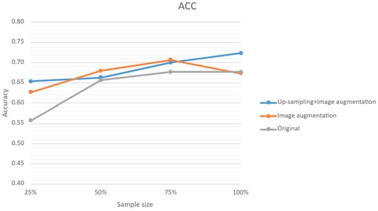 The model’s accuracy was positively correlated with the increase in sample size; however, accuracy was substantially improved when up-sampling and image augmentation were implemented, increasing from 56% to 65% at a 25% sampling size. When increasing the sample size with image augmentation alone, the accuracy was saturated at 75%, but decreased by 15% at the end; this could be explained by the inability of the software to recognize the images once they were excessively tweaked. The results of the binary and ternary predictions with our supplemented data can be found in Figure 7.