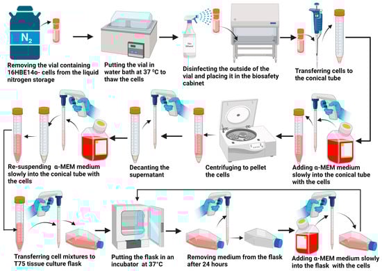 16HBE14o-human bronchial epithelial cells (Cat. No. SCC150), isolated from a 1-year-old male heart–lung patient, were purchased from Millipore Sigma (Sigma Cat. No. M2279, Saint Louis, MO, USA). Cryopreserved cells were cultured according to the supplier’s instructions. The cell culturing process is illustrated in Figure 1. At first, the vial containing frozen 16HBE14o cells was removed from liquid nitrogen storage and put in a water bath at 37 °C. As soon as the cells were completely thawed, the outside of the vial was disinfected with 70% ethanol, and the vial was placed in a biosafety cabinet (SterilGARD II Advance, Baker, Sanford, ME, USA). The cells were transferred using a 1 mL pipette to a sterile 15 mL conical tube. Using a 10 mL pipette, 9 mL of α-MEM medium (cell growth medium) was slowly added dropwise into the conical tube with the cells. The cell suspension with the medium in the conical tube was mixed gently using a pipette to draw the cell suspension with the medium into the pipette and then expel it back into the conical tube, repeating this process twice to ensure thorough mixing without damaging the cells. The conical tube was then centrifuged at 900 rpm for 2–3 min to pellet the cells and separate the supernatant. Then, the supernatant was gently decanted as much as possible from the conical tube. These steps were necessary to remove residual cryopreservatives. Then, 10 mL of α-MEM medium was resuspended slowly into the conical tube with the cells. The cell mixture was transferred to an ECM-coated T75 tissue culture flask. Then, the flask with the cells was placed in a humidified incubator at 37 °C with 5% CO2. The next day, the medium in the flask was removed from the flask, and 10 mL of fresh α-MEM medium was added in. Every other day, the medium in the flask was replaced with fresh medium until the flask reached 90% cell confluency by visual estimation using a microscope. Cell confluency refers to the degree to which a culture of adherent cells in a flask fills a given area, typically measured as a percentage of the surface area of the flask covered by the cells.