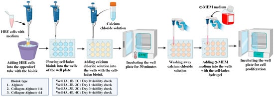 Figure 2 illustrates the preparation steps of the cell-laden hydrogel. Three individual 12-well plates were used for three bioink compositions. For each 12-well plate, 3 wells were used for each day’s cell viability assessment for a specific bioink composition. Bioink in an Eppendorf tube was stored in an ice bath prior to the addition of cells to prevent premature thermal gelation. To prepare the cell-laden bioink, 1 mL of the HBE cells with a medium (prepared by following the procedure described in Section 2.1) was added to the bioink to create a final volume of 3 mL, with an effective cell density of approximately 1.55 × 105 cells per milliliter of bioink. Then, using a micropipette (an instrument used to deposit precise volumes of liquid), 250 µL of cell-laden bioink for each composition was added into individual wells of the 12-well plate. Afterwards, the same amount of 300 mM calcium chloride solution was added into the wells with the cell-laden bioink for the ionic crosslinking of bioink, as alginate forms hydrogel in the presence of divalent cations. The addition was performed in a biosafety cabinet. Then, the well plate was incubated at 37 °C in a humidified incubator with 5% CO2 for 30 min for the thermal gelation of the bioink, as collagen forms hydrogel at 37 °C. After completing the gelation process, the calcium chloride solution was washed away from the wells, and 1 mL of α-MEM medium was added into the wells with the cell-laden hydrogel. Finally, the well plate was incubated from Day 0 to Day 6 for cell proliferation.