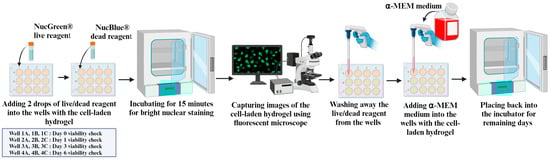 In this study, an Echo revolution fluorescence microscope (model: RON-K, BICO company) was used to conduct the z-stacking of cell-laden 3D samples to assess cell viability in the samples of three different bioink compositions. Z-stacking, a digital image-processing method, combines multiple images taken at different focal distances to provide a composite image with a greater depth of field [,]. The cells were stained with the ReadyProbes™ Cell Viability imaging kit (NucBlue®, NucGreen®) (Invitrogen™, R37609, ThermoFisher Scientific, Waltham, MA, USA) for fluorescence microscopy. The NucBlue® live reagent stains the nuclei of all live cells and turns the nuclei of the cells highly fluorescent blue in color, which can be detected with a standard DAPI filter of the microscope. The NucGreen® dead reagent stains only the nuclei of dead cells with compromised plasma membranes and turns the nuclei of the dead cells into highly fluorescent green in color, which can be detected with the standard FITC filter of the microscope. The assessment process of cell viability is described below and illustrated in Figure 3.