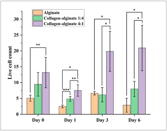 Effects of bioink composition on live cell count (* indicates p-value < 0.05, ** indicates 0.05 < p-value < 0.085, and *** indicates 0.085 < p-value < 0.16).