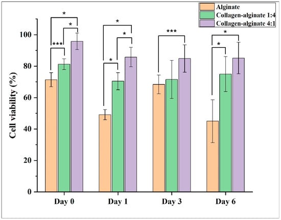 The effects of bioink composition on live cell count and cell viability are shown in Figure 4 and Figure 5, respectively. The error bars in these figures represent the standard deviation among the three samples for each bioink composition. Figure 4 shows that, on Day 0, Day 1, and Day 6, live cell count was the highest for the collagen–alginate 4:1 bioink composition and the lowest for the alginate bioink composition. Figure 5 shows that the collagen–alginate 4:1 bioink composition provides higher cell viability from Day 0 to Day 6 than the collagen–alginate 1:4 bioink composition and alginate bioink composition. For the alginate bioink composition, cell viability was 71.4% on Day 0 but reduced to 45.0% on Day 6. According to ISO 10993, a reduction in cell viability by more than 30% is considered a cytotoxic effect []. For the collagen–alginate 1:4 bioink composition, cell viability was 81.2% on Day 0 and 75.0% on Day 6. The trends observed from this study are consistent with reported trends in the literature. For example, it was reported that a higher alginate proportion in alginate–collagen bioink caused a decrease in cell viability; a higher collagen proportion in alginate–collagen bioink tended to increase the cell viability of human pulmonary lung fibroblasts cells in printed samples [].