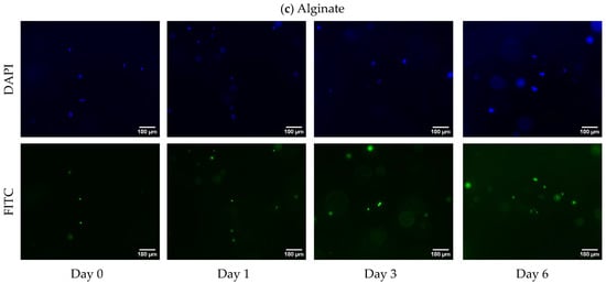 Figure 6 shows that the number of live cells within the cell-laden hydrogel of the collagen–alginate 4:1 bioink composition was noticeably higher than the other two bioink compositions. Clusters of cells could be observed in the images on Day 1, and the clusters gradually became larger from Day 1 to Day 6. In other words, cells proliferated better within the cell-laden hydrogel of the collagen–alginate 4:1 bioink composition than the collagen–alginate 1:4 bioink composition and alginate bioink composition. From the FITC images (with dead cells detected) in Figure 6c, it can be observed that the number of dead cells was higher within the cell-laden hydrogel of the alginate bioink composition compared with the other two bioink compositions. This result indicates that the pure alginate bioink composition is less compatible than collagen–alginate bioink compositions. This means that human HBE cells are more compatible with bioink compositions that have a higher collagen proportion. This is likely because collagen–alginate bioink compositions with a higher collagen proportion contain a greater number of cell-binding ligands, facilitating better cell attachment and interaction [,,]. The higher collagen content may also better mimic the ECM of human bronchial epithelial (HBE) cells, improving the porosity and permeability of the hydrogel and allowing the better diffusion of nutrients and oxygen to the HBE cells.