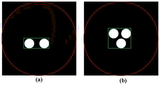 The cylinder phantom used in the training data simulation with two targets and three targets (a) two targets, (b) three targets, the region within the red circle is the entire reconstruction region, the region within the green rectangular box is the target region.