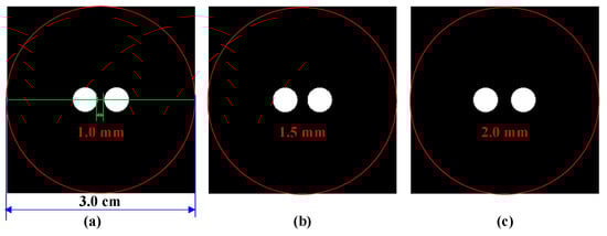 The cylinder phantom used in simulation studies. Edge-to-edge distance between the two targets: (a) 1 mm, (b) 1.5 mm, (c) 2 mm, the red circle is the boundary of the phantom, the green line is the centerline of the phantom.