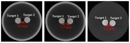 Configuration for the two-target phantom experiment. The concentrations of the two targets were both 50 mg/mL, and the edge-to-edge distances of the two targets were 2.3 mm, 1.7 mm, and 1.0 mm.