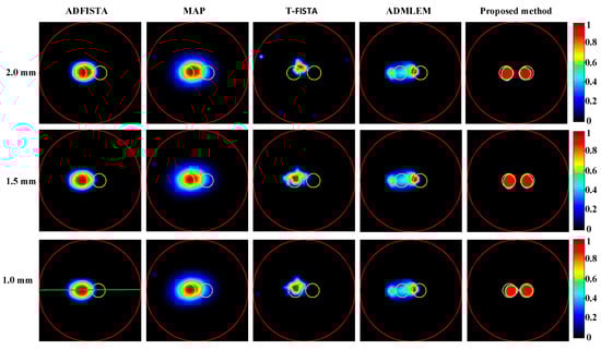 Firstly, CB-XLCT reconstruction results were obtained for targets placed at varying edge-to-edge distances (EEDs) using ADFISTA, MAP, T-FISTA, ADMLEM, and the proposed DeepCB-XLCT network, as depicted in Figure 6. Normalization of all reconstruction results was performed based on their respective maximum intensity values. It can be observed that in the cases of the ADFISTA, MAP, and T-FISTA algorithms, distinguishing between the two targets proved challenging. With the ADMLEM method, while the distribution of the two targets could be differentiated, it exhibited relatively large localization errors. In contrast, the reconstruction using the proposed DeepCB-XLCT network demonstrated improved shape similarity to the ground truth and resulted in less noise compared to the other four algorithms.