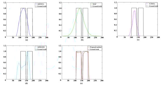 Profiles along the green dotted line in Figure 5 with the edge-to-edge distances of 1.0 mm. (a–e) The profiles of reconstruction results achieved with ADFISTA, MAP, T-FISTA, ADMLEM, and the proposed DeepCB-XLCT network, respectively.